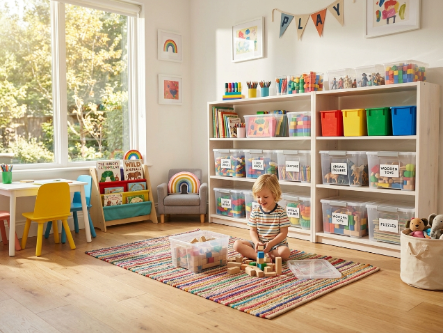 • Des bacs de rangement transparents : Indispensables pour que l’enfant voie immédiatement ce qu’il y a dedans sans tout vider.