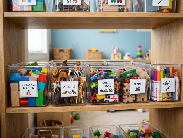 4. Mise en place des étiquettes : Collez une photo du type de jouet sur chaque bac. « Ici, on met les voitures ». C’est un code visuel clair et indéniable.